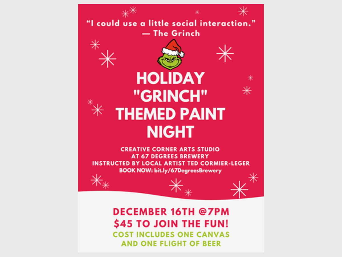 Holiday "Grinch" Themed Paint Night! Creative Corner Art Studio at 67 Degrees Brewery on Grove Street in Franklin. Instructed by local artist Ted Cormier-Leger. December 16th at 7pm. $45 to join the fun. Cost includes one canvas and one flight of beer. Book a spot: PaintNight