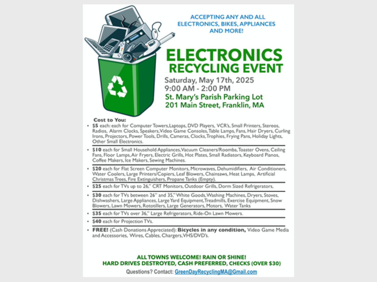 St. Mary's Church is hosting an Electronics Recycling Event from 9 a.m. to 2 p.m. on Saturday May 17. The collection event will be held in the Old Benjamin Franklin School parking lot at 201 Main Street.
