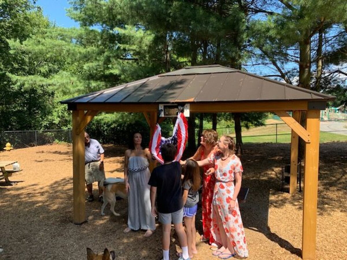 So, at long last, Saturday morning D’Onofrio and dozens of others friends, family, and colleagues of Andy gathered at the dog park for the unveiling of the plaque, kept initially shrouded by flag-themed bunting.