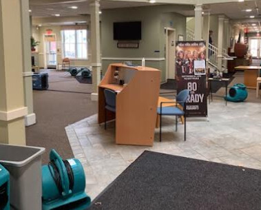 At about the time that crews were clearing up damage from a burst pipe Saturday morning at the Library, another, larger pipe burst at the Franklin Senior Center. The facility is closed with no definite date yet for reopening, though efforts are being made to get the kitchen in service for food deliveries. The image above shows multiple fans deployed Tuesday afternoon, still trying to dry the flood waters. Frozen pipes are the bane of municipal buildings in Franklin, with numerous instances of serious damage over the years.