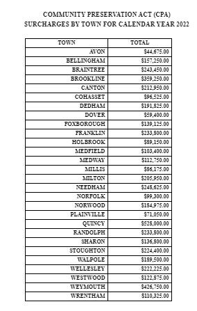 The fees for the CPA are set by the State Legislature on land documents recorded here at the Norfolk County Registry of Deeds. The following chart provides an illustration of the funds generated by the CPA in your community based on recorded real estate filings for that community during the 2022 calendar year.