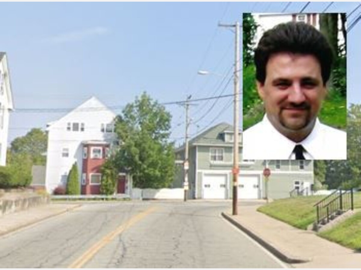 Above, a Google Street view image shows the intersection of Providence and South Main in Woonsocket, RI, site of the fatal accident. Inset show obituary image of victim, Brian Blanchette.