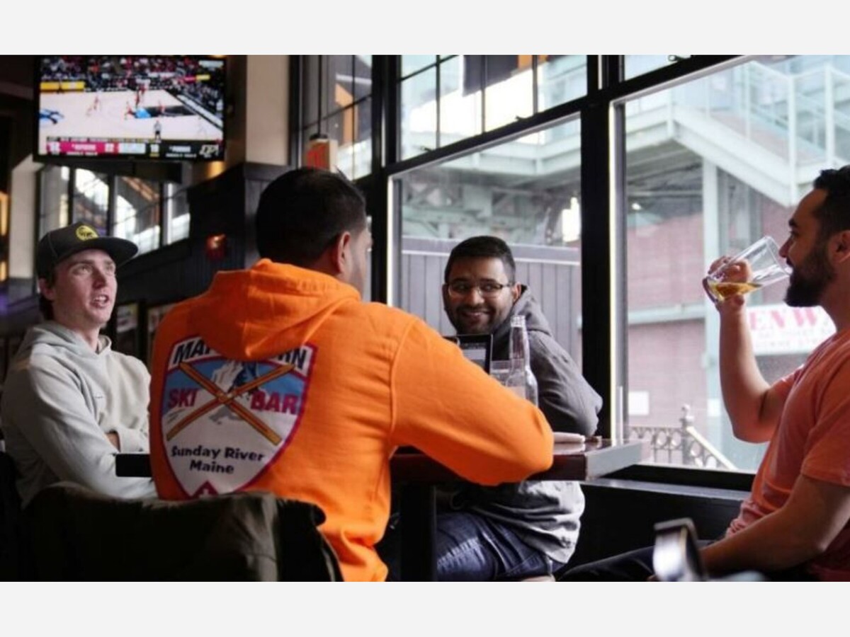 A group of young men watch the men’s basketball game between Rutgers and Purdue at a sports bar in Boston earlier this month after one placed a wager on his phone. Several states are working to tackle gambling addiction as they legalize sports betting. Charles Krupa/The Associated Press