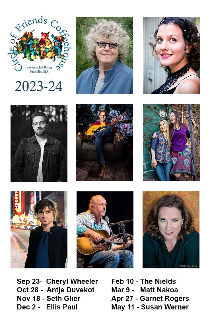 The Circle of Friends Coffeehouse is a non-profit organization affiliated with Franklin's First Universalist Society. Concerts are presented in a smoke free and alcohol free environment at the Society's handicapped accessible Meetinghouse, 262 Chestnut St. in Franklin, and begin at 8:00 PM; doors open at 7:30 PM. Beverages and gourmet desserts will be available. Please visit http://www.circlefolk.org/ to purchase tickets or for more information.