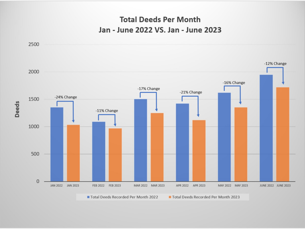 The number of deeds for June 2023, which reflect real estate sales and transfers, both commercial and residential, was 1,721, a decrease of 12% from June 2022 but an increase of 27% from the previous month of May.
