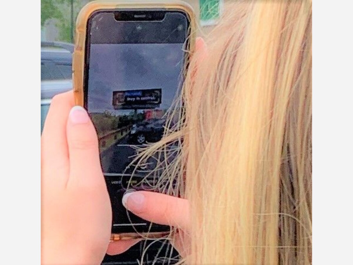 Above, Jami Pandiscio (FHS `20) snaps an image of "her" billboard on Route 1 in Wrentham. Pandiscio's slogan and concept for a safety message was one of the winners from thousands of entries.