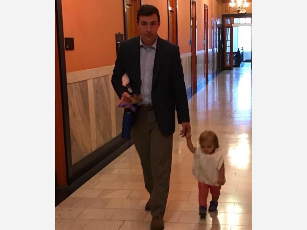 The only senators in attendance were Sen. Brownsberger of Belmont presiding. Sen. Fattman of Sutton was also present, joined on the floor by his four children. (Earlier photo, above, shows Fattman with one of his children on Beacon Hill).