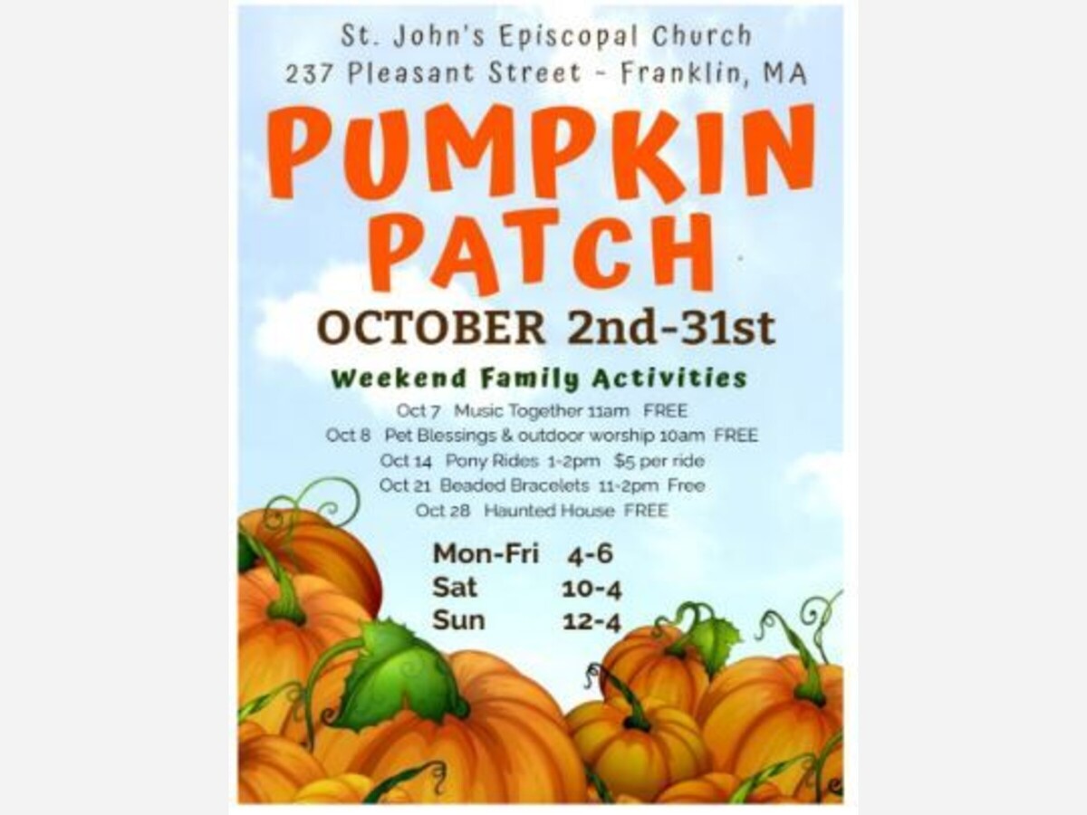 The 4th Annual Pumpkin Sale will be open all month long from October 2 to 31 at St. John’s Episcopal Church, 237 Pleasant Street, Franklin.