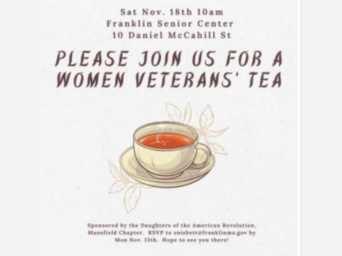 The upcoming Tea is a chance for women veterans to all get together for some coffee, tea, and delicious homemade goodies before the busy holiday season. The event will be held at the Franklin Senior Center. Women veterans from any town are welcome. Please RSVP via email to Veterans’ Agent Shannon Nisbett at snisbett@franklinma.gov