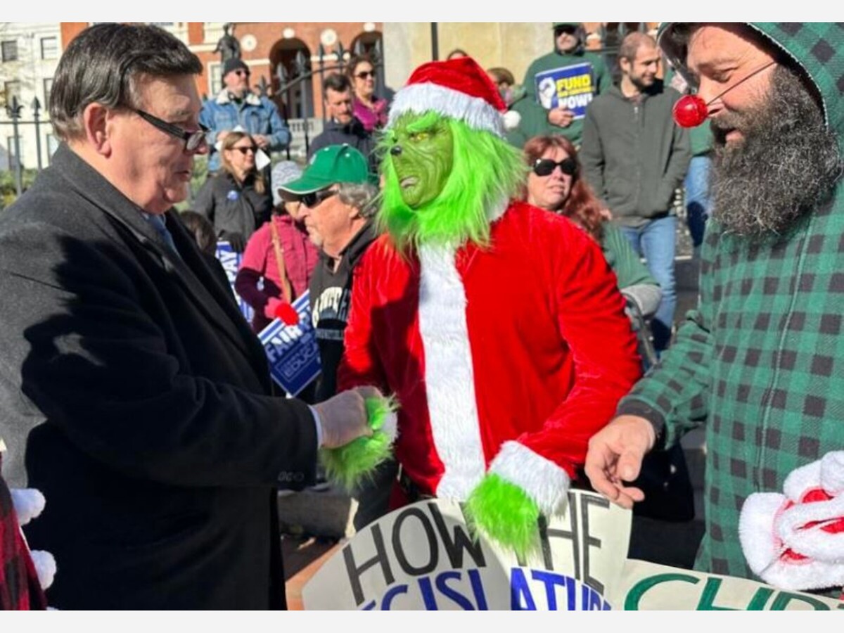 Sen. Marc Pacheco shakes hands with a protester dressed as the Grinch at a State House rally on Monday, Nov. 20, 2023 as hundreds of state employees called on the Legislature to fund their overdue raises. "I mean, it's been negotiated, they've been waiting. They're absolutely correct. You know, there's no reason why we have waited this long to have these contracts ... implemented and funded," Pacheco said, calling the situation "not fair" and "ridiculous."
