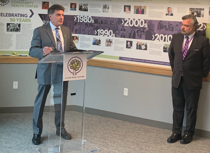 Above, Milford Selectman Paul Mazzuchelli speaks at Health Center opening. Stephen J. Kerrigan, President and CEO of Kennedy Community Health. is at the right.