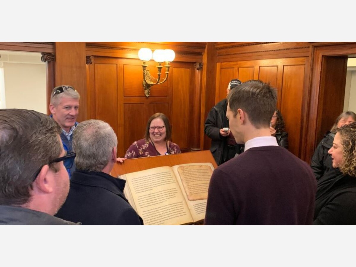 All Politics Was Local on Friday: Foreground, L to R, Councilor Ted Cormier-Leger, Rep. Jeff Roy, Congressman Jake Auchincloss, State Senator Becca Rausch. Back row, Town Administrator Jamie Hellen, Reference Librarian Vicki Earls.
