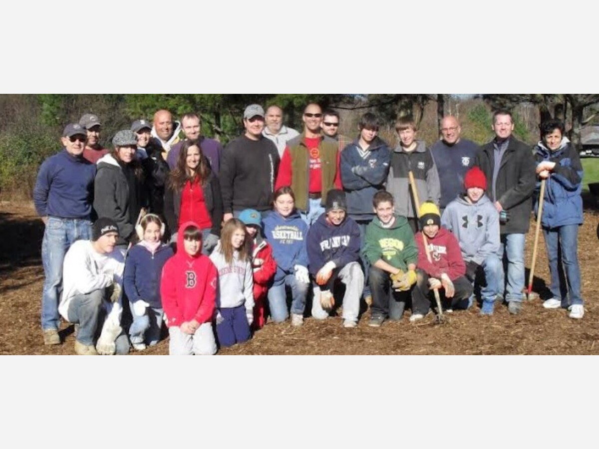Above, volunteers working to build the Dog Park several years ago, Haley Goulet at center front.
