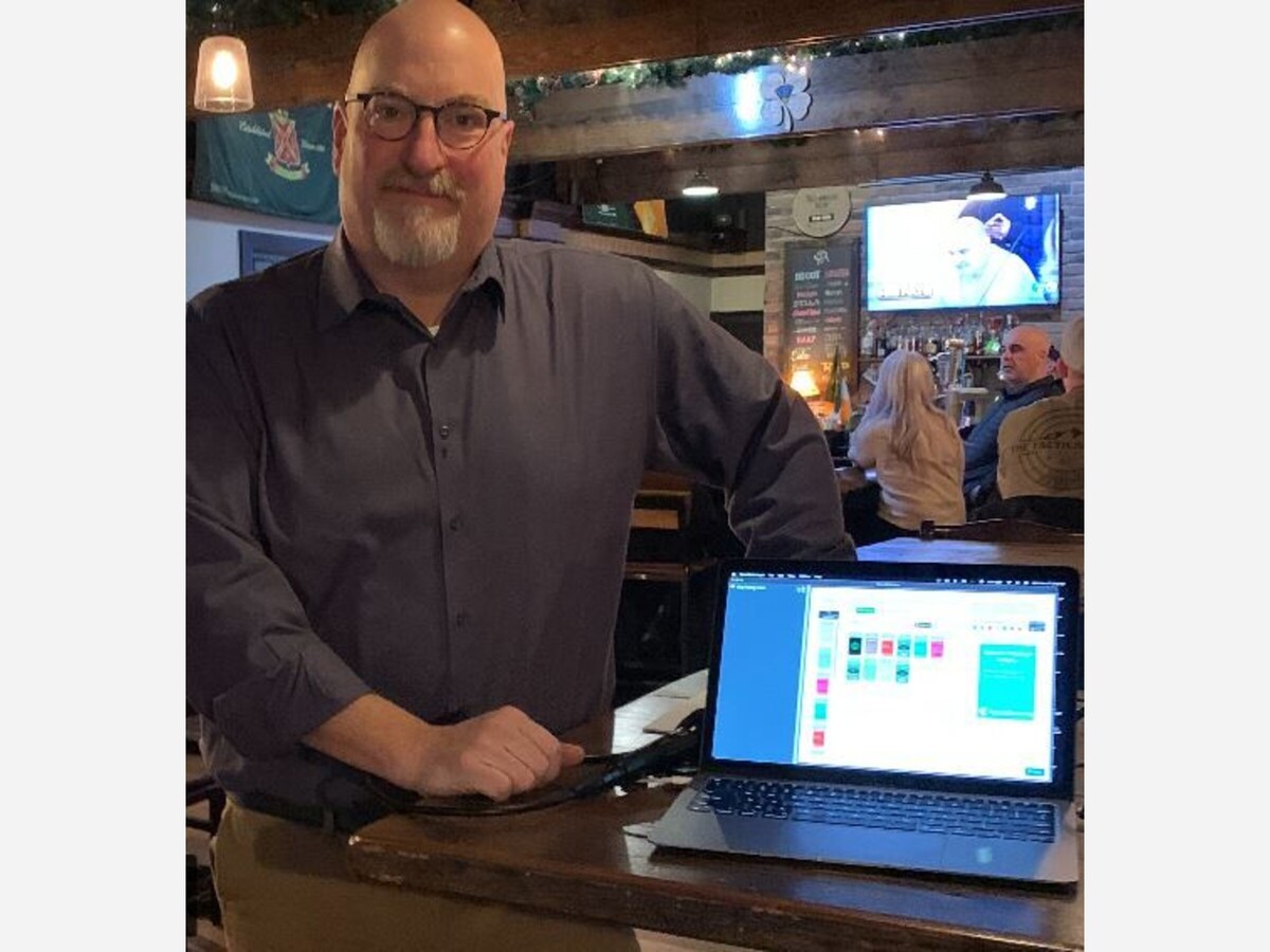 Above, Brian Alfond prepping his trivia gear -- which works with an app on participants phones, early Wednesday evening at Teddy Gallagher's.