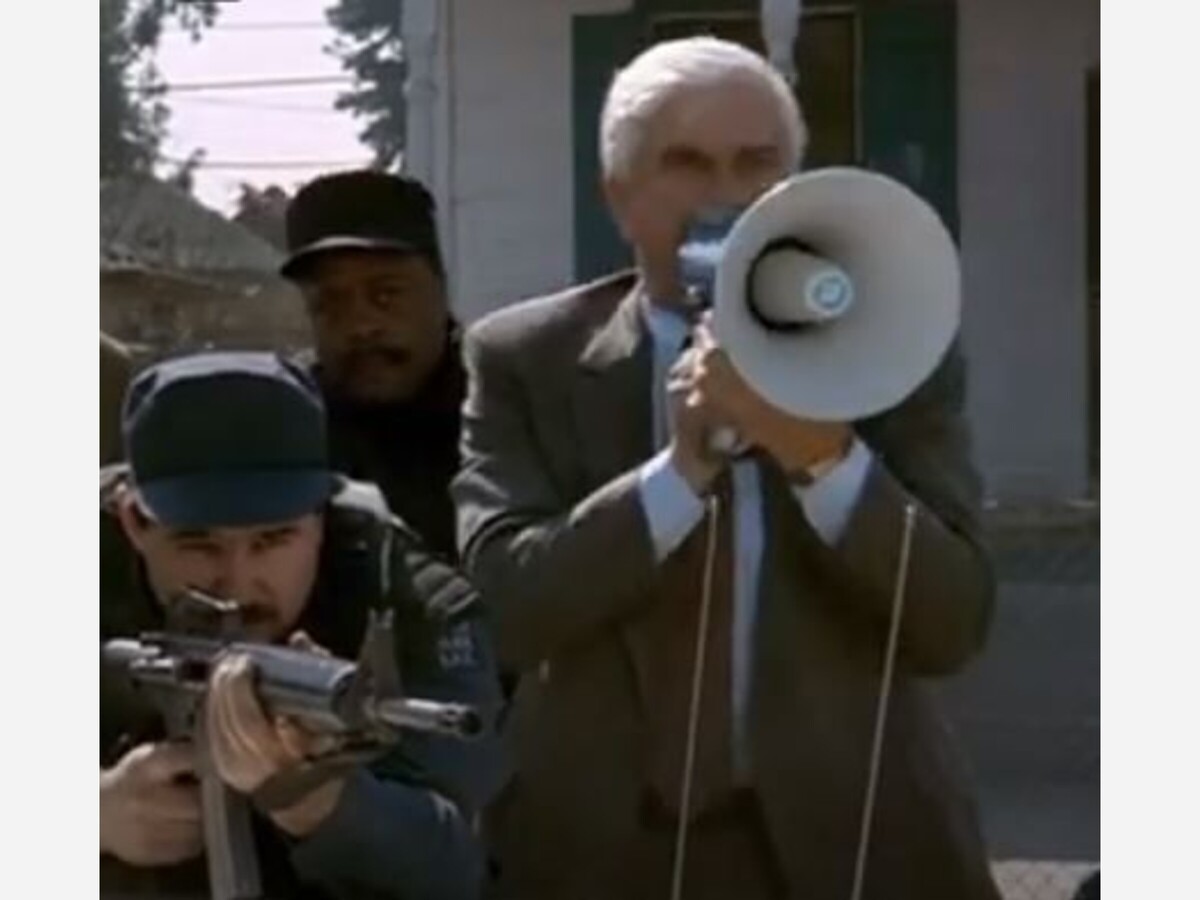 (Above, screen grab of Leslie Nielsen from Naked Gun 2 1/2 --attempting to communicate.)