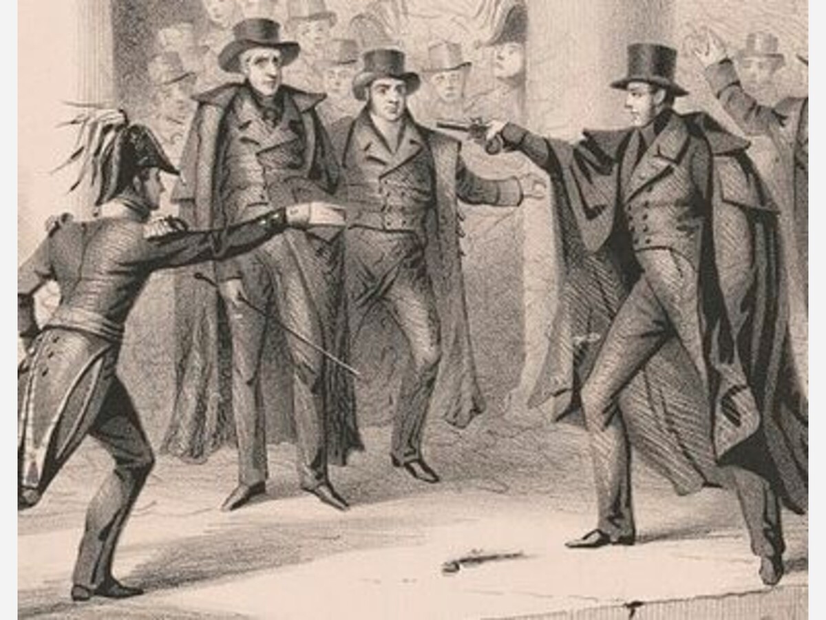 Above, an 1836 engraving illustrating the attempt on the life of Andrew Jackson.