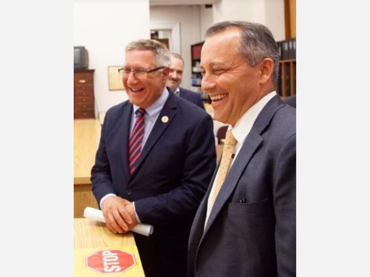 Don't Stop Now! Ways and Means Committee Chairs Aaron Michlewitz (right) and Michael Rodrigues (left) share a laugh as they drop off a compromise fiscal 2025 budget bill in the House clerk's office around 7:45 p.m. on Thursday, July 18, 2024. (Chris Lisinski/SHNS)