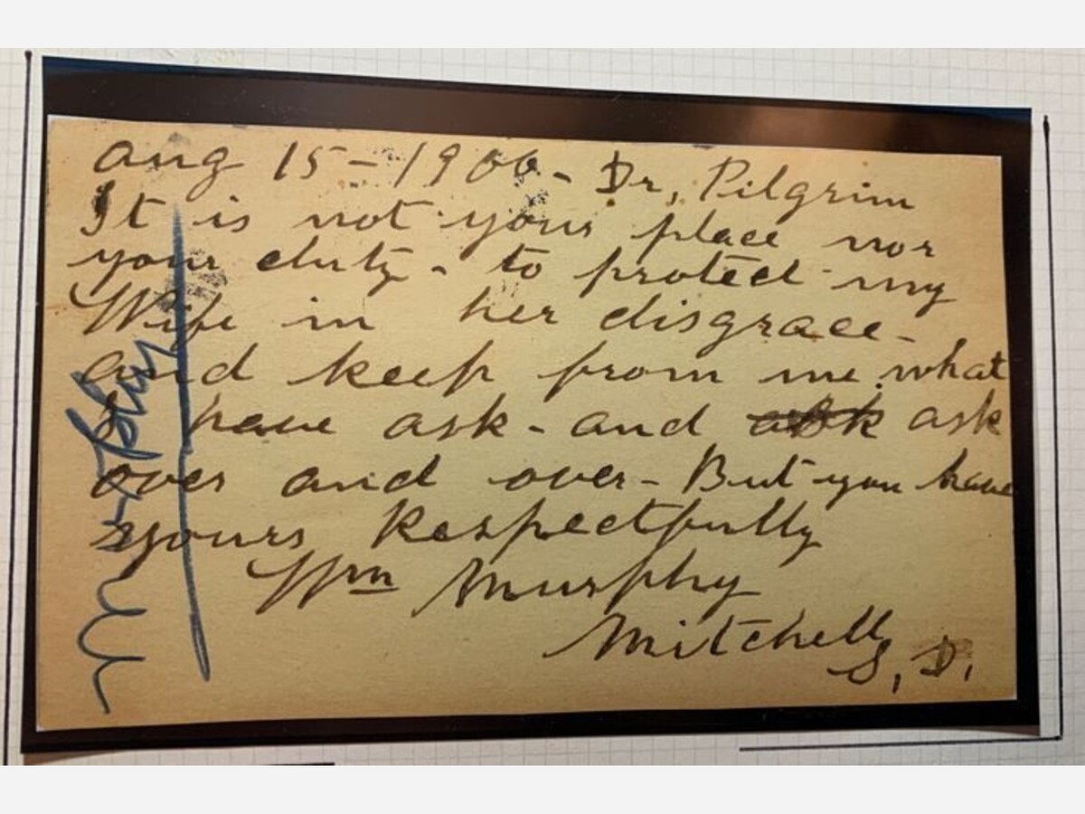August 15, 1900-Dr. Pilgrim, It is not your place-nor your duty-to protect my Wife in her disgrace and keep from me from what I have ask-and ask over and over-But you have. yours Respectfully Wm.Murphy Mitchell, S.D.