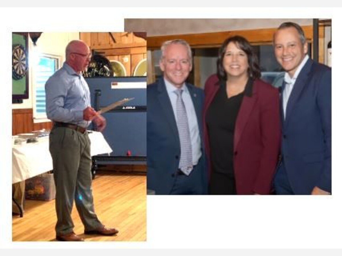 Above, left, Charles Bailey speaks Thursday evening. Right, Jeff Roy and supporters, Lt. Gov. Kim Driscoll and Rep Aaron Michlewicz at Tuesday event.