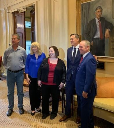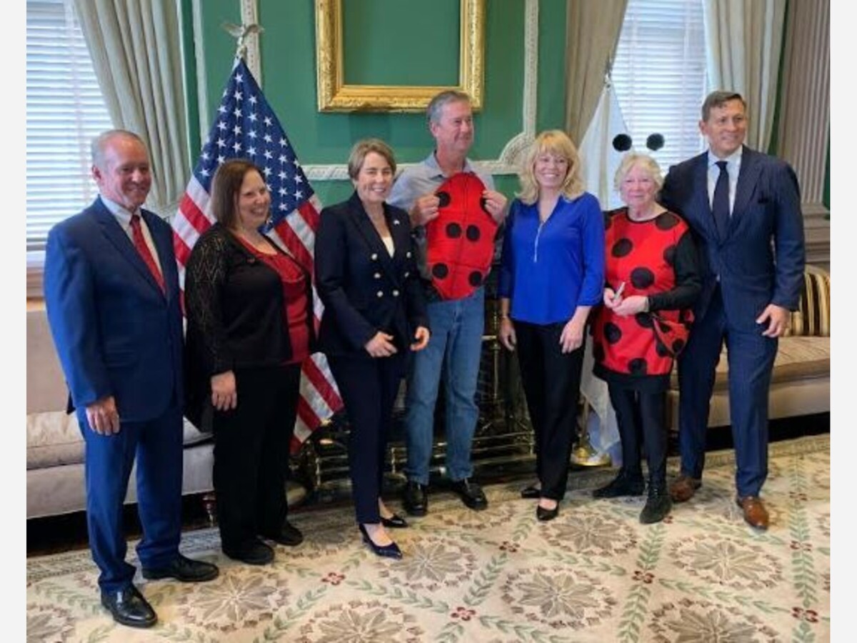 Above, Friday afternoon, Oct. 4 at the Statehouse, (L to R) State Rep. Jeff Roy, 'ladybug' Vicki Earls, Gov. Maura Healey, 'ladybug' Bill MacNeil, holding an original 1974 bug costume, 'ladybug' Joanne Kelleher Lessard, Historical Commission member, Jan Prentice, and 'ladybug'. former State Rep. Jim Vallee.