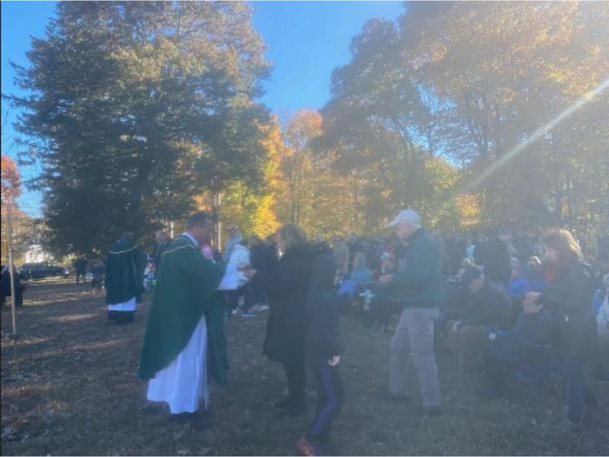 Rev. Robert Poitras, pastor, presided, making a number of appreciate references to first responders and occasionally having to compete with a news helicopter overhead. A crowd of hundreds attended the Mass.
