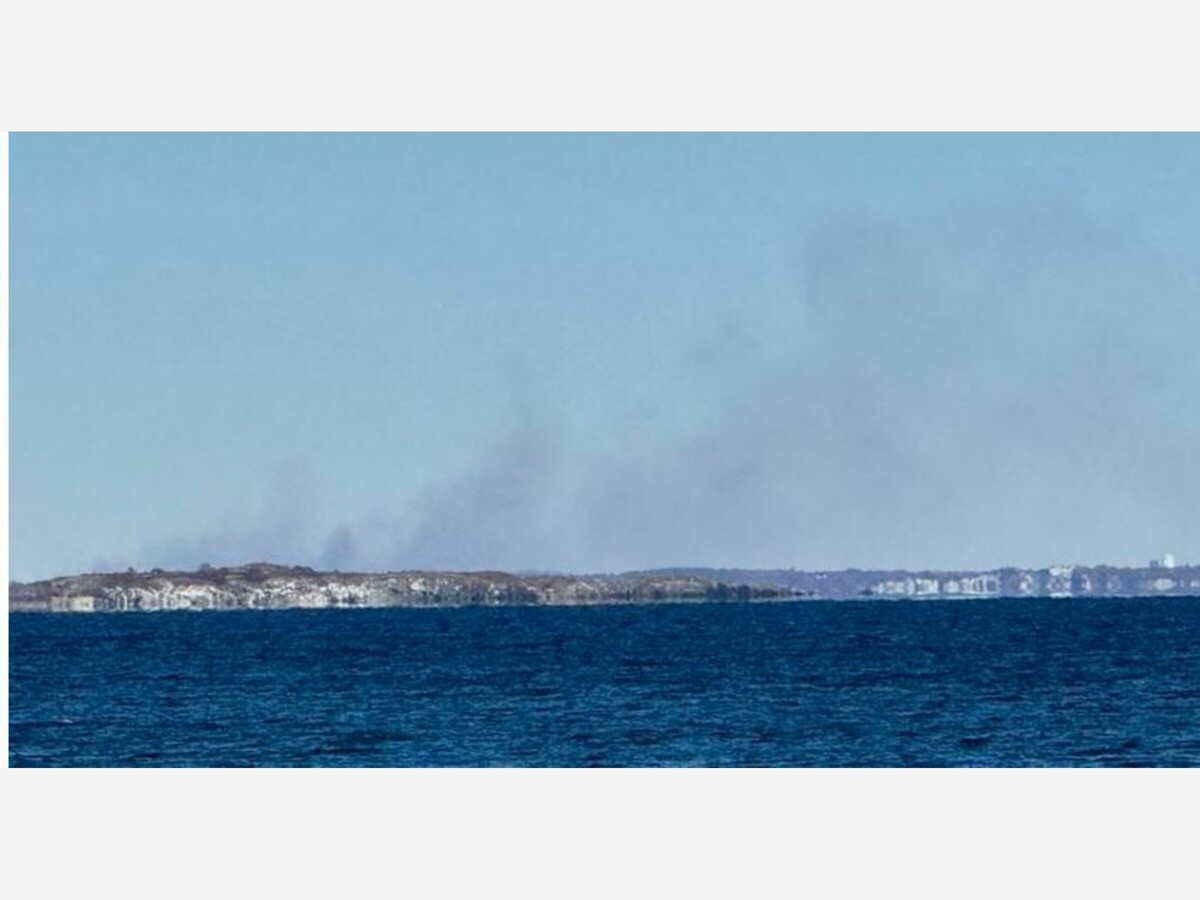 Smoke billows up from Massachusetts brush fires on Sunday, Oct. 27, 2024 looking north across Boston Harbor from Nantasket Beach. --Michael P. Norton/SHNS