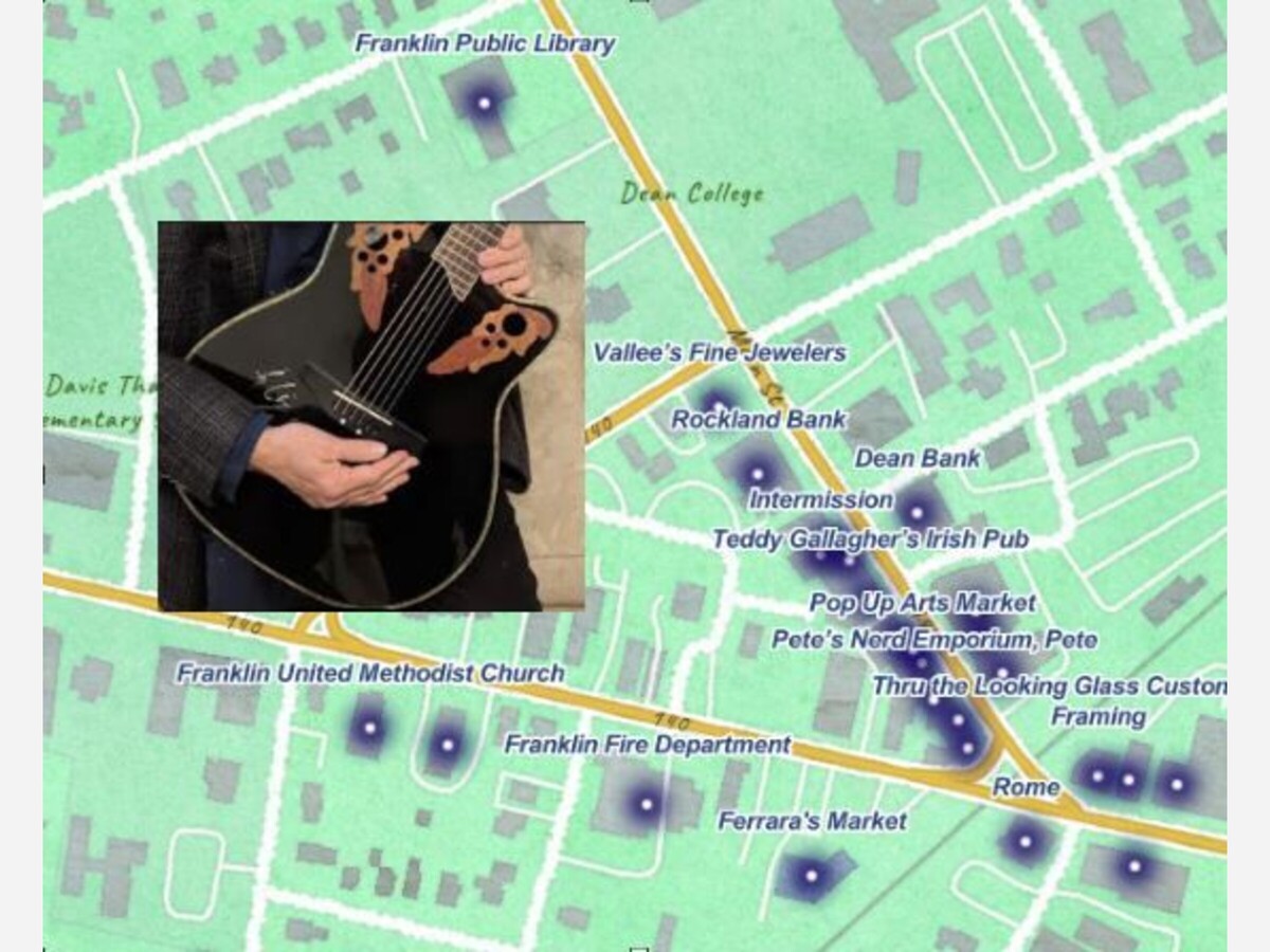 Above, a map of wreath locations for A Wreath of Franklin Saturday with photo inset of the jazz-infused guitar of Frank Saccoccio, performing at the Historical Museum 1-3 as part of the day's festivities.
