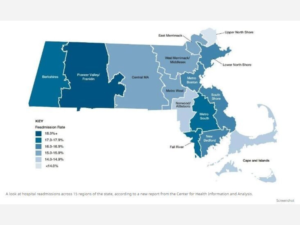 CHIA carved the state into 15 geographic regions and found patients living in the Pioneer Valley/Franklin region had the highest readmission rate of 18.5%. The lowest rate was 13.9% in the Upper North Shore.