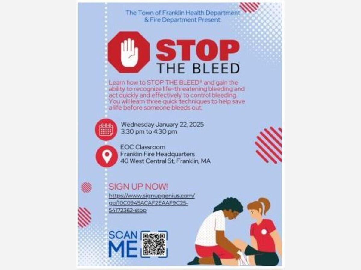 The Town of Franklin Health Department & Fire Department Present: Stop the Bleed! Learn how to STOP THE BLEED and gain the ability to recognize life-threatening bleeding and act quickly and effectively to control bleeding.
