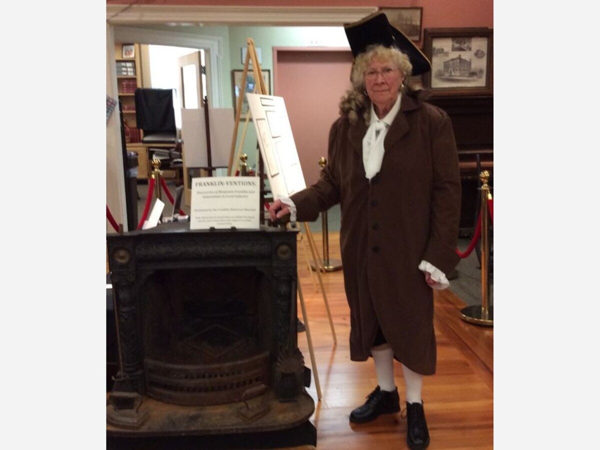 Above, Ben Franklin(Historical Commission member Jan Prentice) strikes a pose with a Franklin Stove and other innovations in the themed display at the Franklin Historical Museum on Saturday as part of Ben Franklin Month.