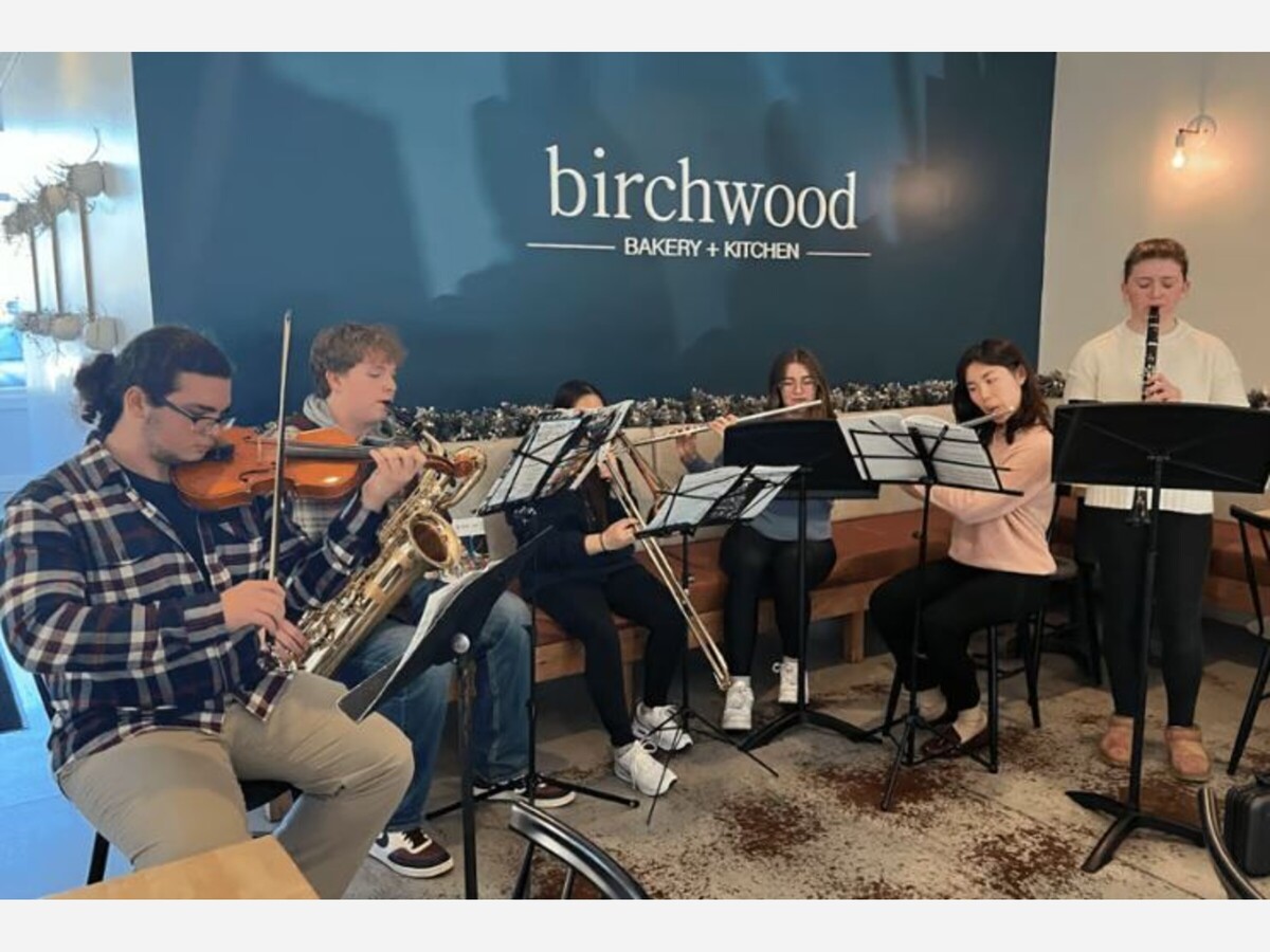 Franklin High School band students perform at the Birchwood Bakery & Kitchen. (Photo courtesy Franklin Public Schools)