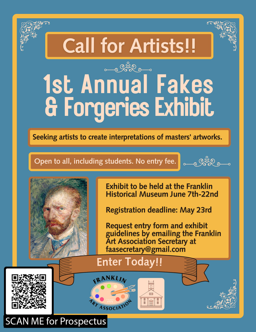 Sue Sheridan with the Franklin Art Association and the Chair of the Historical Commission began discussing a possible collaboration in mid-2024 and then Sheridan hatched the idea of Fakes & Forgeries, which not only provides wide creative opportunities for local artists, it also offers a fresh way to connect to historical artwork from America and around the world. The concept matched with the museum's goal of keeping history fresh and exciting...