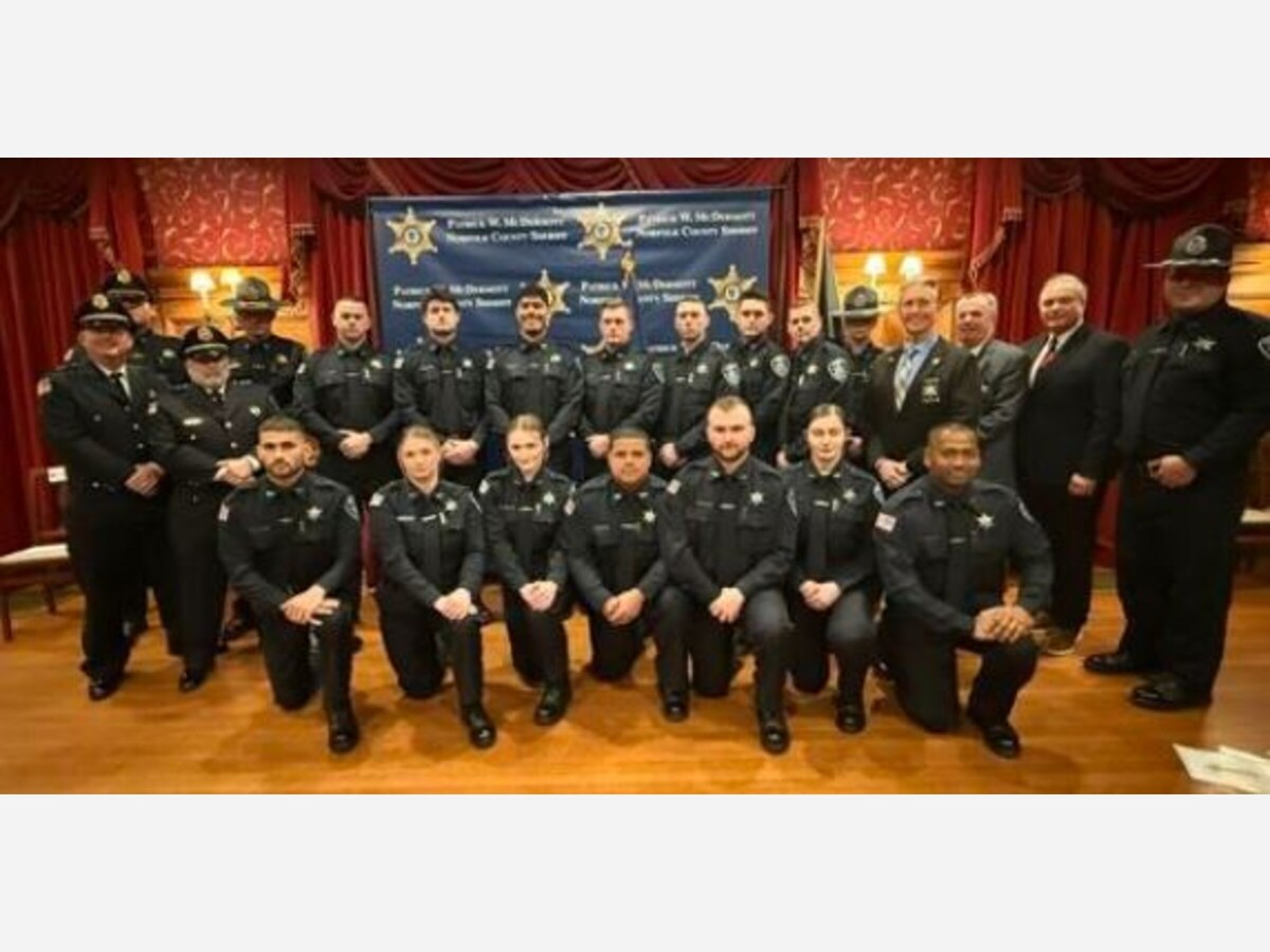 Back row, from left: Asst. Superintendent Thomas Brady, Asst. Academy Commander Lt. Todd DeBoer, Asst. Dep. Superintendent Bob Russo, Academy Commander Capt. Francis Reynolds, Officer Michael Forde, Officer Benjamin Wines, Officer David Borges, Officer Ryan Boretti, Officer Paul Crowley, Officer Owen Sullivan, Officer Shawn Closson, Fitness instructor Officer Stevie Orton, Sheriff Patrick W. McDermott, Special Sheriff Christopher Bell, Superintendent Michael Harris, and Field Training Officer Ryan Howell.