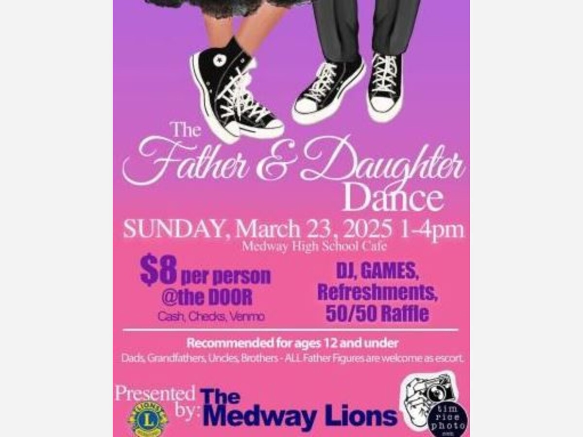 Join the Medway Lions Club for the Father & Daughter Dance on Sunday, March 23, 2024, from 1:00-4:00 pm. Enjoy an afternoon of fun with photos by Tim Rice Photo, games, refreshments, and a 50/50 raffle!