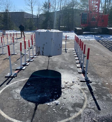 Above, a crane operator apprentice shows off his ability to deftly move a large load along a ground level path delineated by markers.