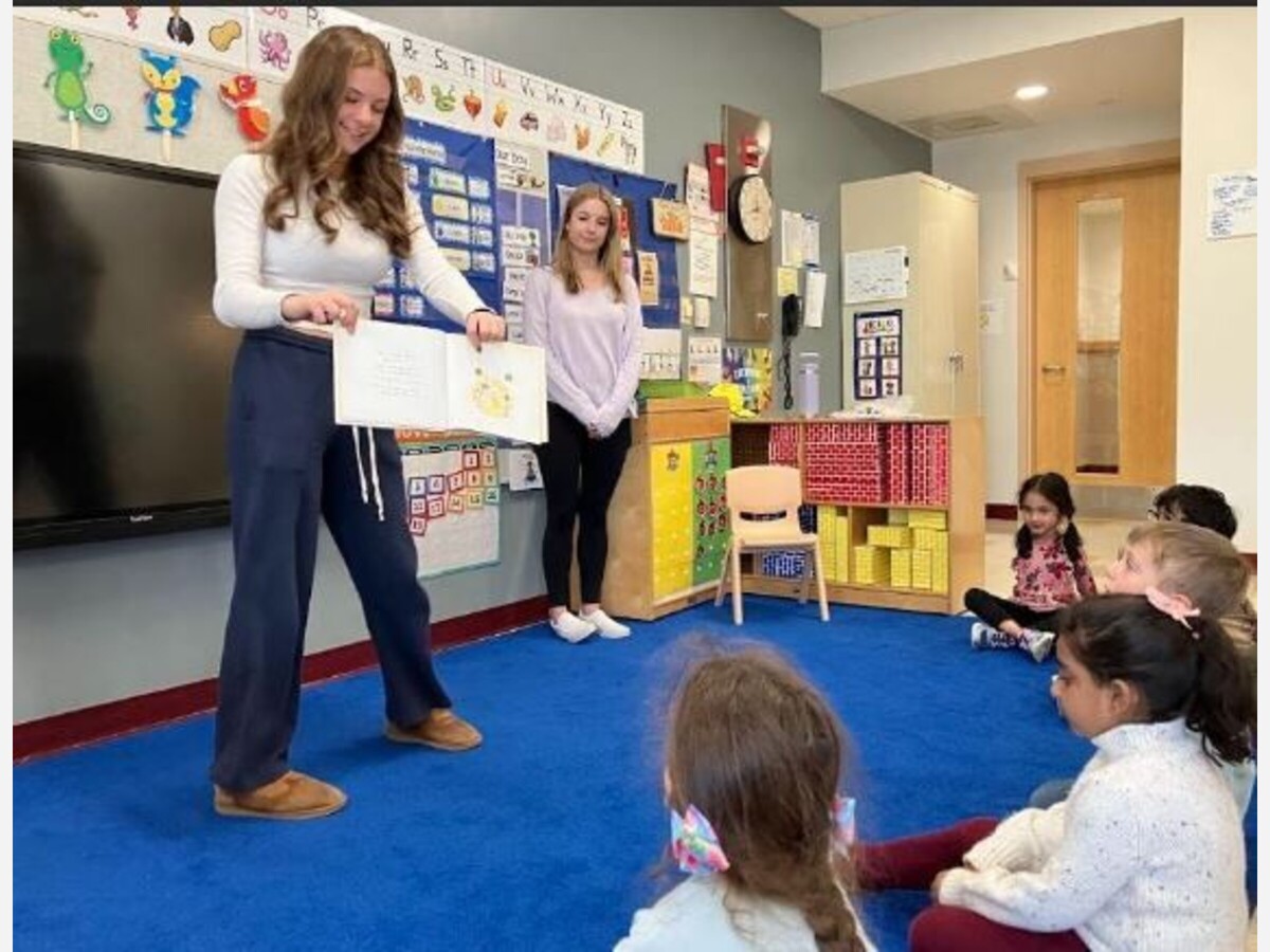 Student volunteers from the Franklin High School Early Childhood Class read to preschoolers at the at the F.X. O'Regan Early Childhood Development Center. (Photo courtesy Franklin Public Schools) |