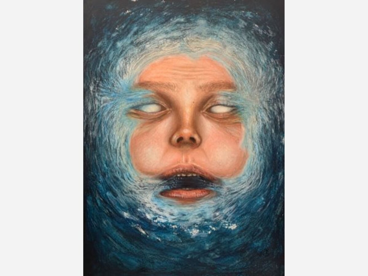 Above, 'Lifeless Currents', a studen work submitted as part of an AP Art and Design exam. Material(s): Watercolors, Prismacolors colored pencils | Process(es): I used a mirror to imitate facial expressions as I sketched the proportions and used harsh colors. | Citation(s): Used my own reflection | Idea(s): This photo represents the overwhelming feelings of emptiness and being engulfed in emotion. | Curatorial Note: This artwork is very expressive and successfully communicates the idea of being inundated and overwhelmed with emotions.