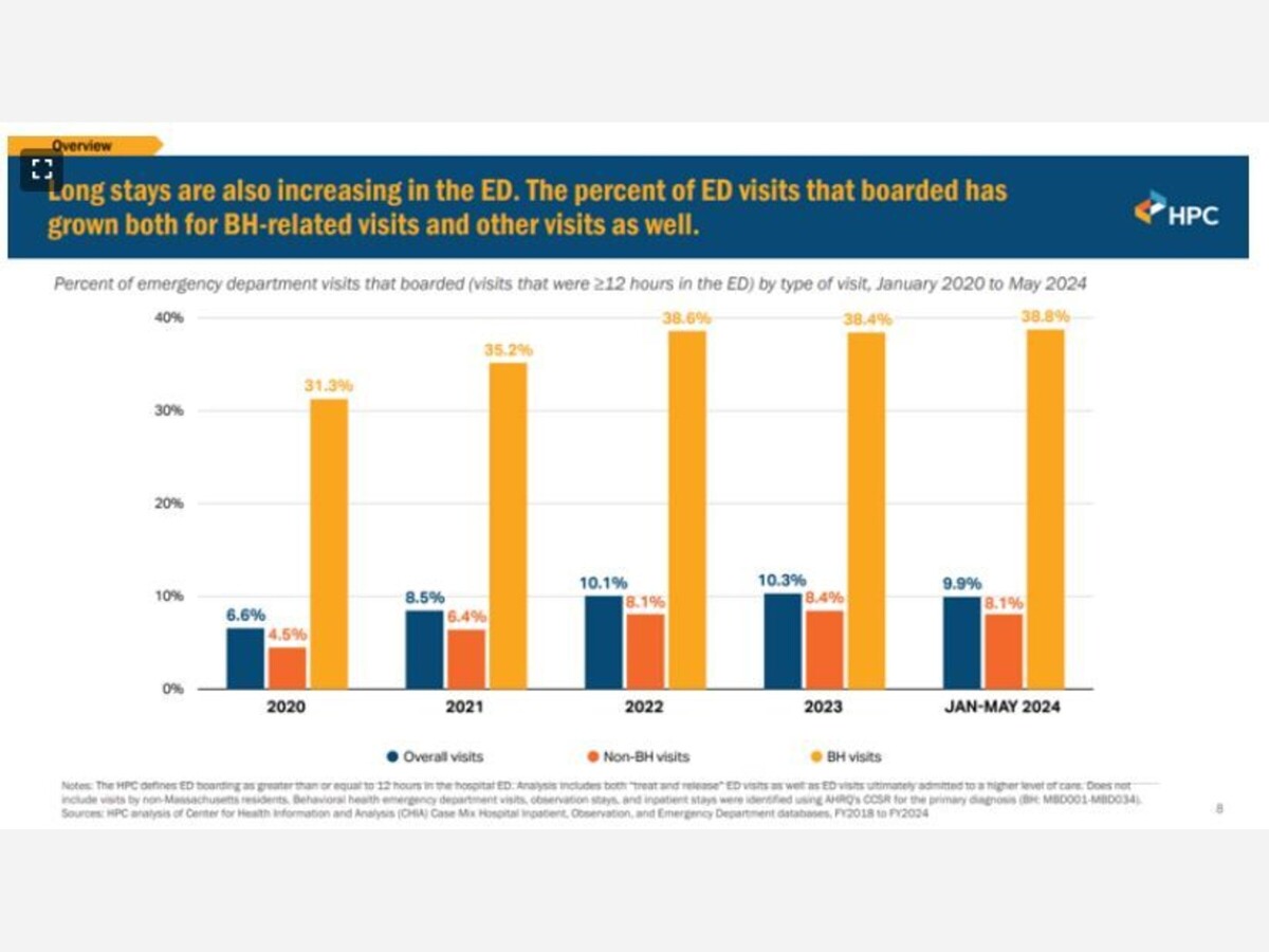 Nearly 39 percent of behavioral health-related emergency department visits lasted more than 12 hours before discharge or admission to a higher level of care between January 2024 and May 2024, up from 31.3 percent in all of 2020, researchers at the Health Policy Commission said Thursday.