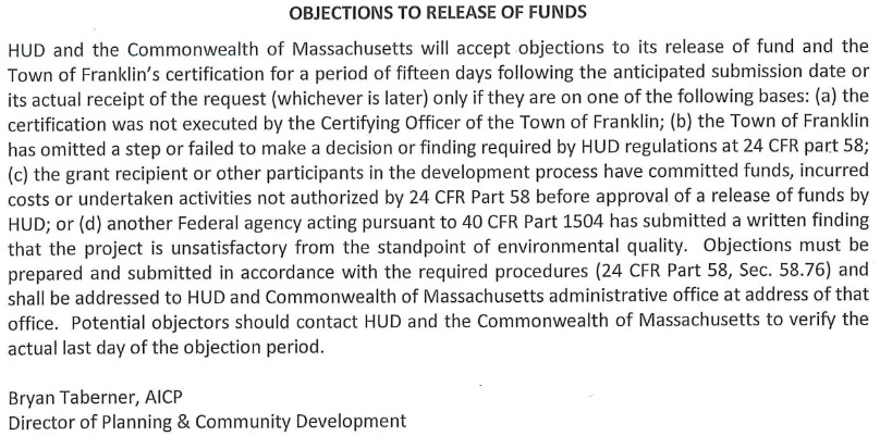 The Town of Franklin has determined that the project will have no significant impact on the human environment. Therefore, an Environmental Impact Statement under the National Environmental Policy Act of 1969 (NEPA) is not required. Additional project information is contained in the Environmental Review Record (ERR) on file at BETA Group, Inc., 89 Shrewsbury Street, Suite 300, Worcester MA 01604; and the Town of Franklin Planning Department, 355 East Central Street, Franklin MA 02038. The ERR may be examined or copied at BETA Group, Inc. on weekdays 9:00 A.M. to 5:00 P.M., or at the Town of Franklin Planning ·Department on Monday, Tuesday or Thursday 8:00 A.M. to 4:00 P.M., Wednesday 8:00 A.M. to 6:00 P.M., or Friday 8:00 A.M. to 1:00 P.M.