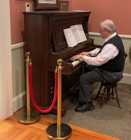About 25 people came to the Franklin Historical Museum for a deep-dive on the topic of 12-tone composition (a form of 'classical' music pioneered in the early 20th century. Below, composer Jon Mitchell makes makes a point about the development of 12-tone, while fellow presenter, educator Randy LaRosa (far left) looks on. Lower image shows Mitchell demonstrating contrasting musical structures on the museum's Trowbridge Piano.
