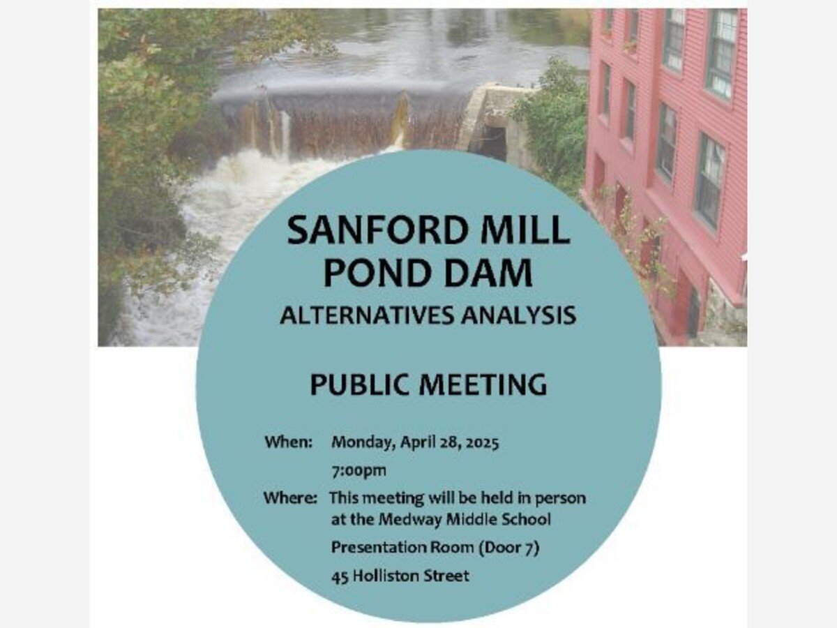 The Medway Project Team invites members of the public to an introductory meeting on the Sanford Mill Pond Dam Alternative Analysis Project. The meeting will be held on Monday, April 28, 2025, at 7:00 pm. This meeting will be held in person at the Medway Middle School, Presentation Room (Door 7), 45 Holliston Street.
