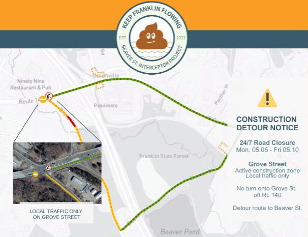 Traffic turning onto Grove St from Rt. 140 will be detoured over to Beaver Street via Rt. 140. Please follow posted detour signs for directions. Access to all businesses and properties on Grove Street between Forge Hill Road and Rt. 140 will be open to local traffic only.