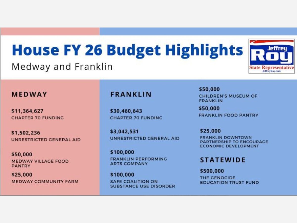 State Representative Jeffrey Roy (D-Franklin) announced what he termed as key victories for Franklin, Medway, and the Commonwealth in the Fiscal Year 2026 (FY26) House budget, a $61.47 billion spending plan focused on economic opportunity, education, housing, and transportation — passed without new taxes.