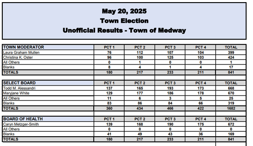 The Medway Town Election was held May 20, 2025 from 7:00 am - 8:00 pm at the Medway Middle School 45 Holliston Street Door 8. And, the unofficial results have been shared by Town Clerk Stefany Ohannesian: