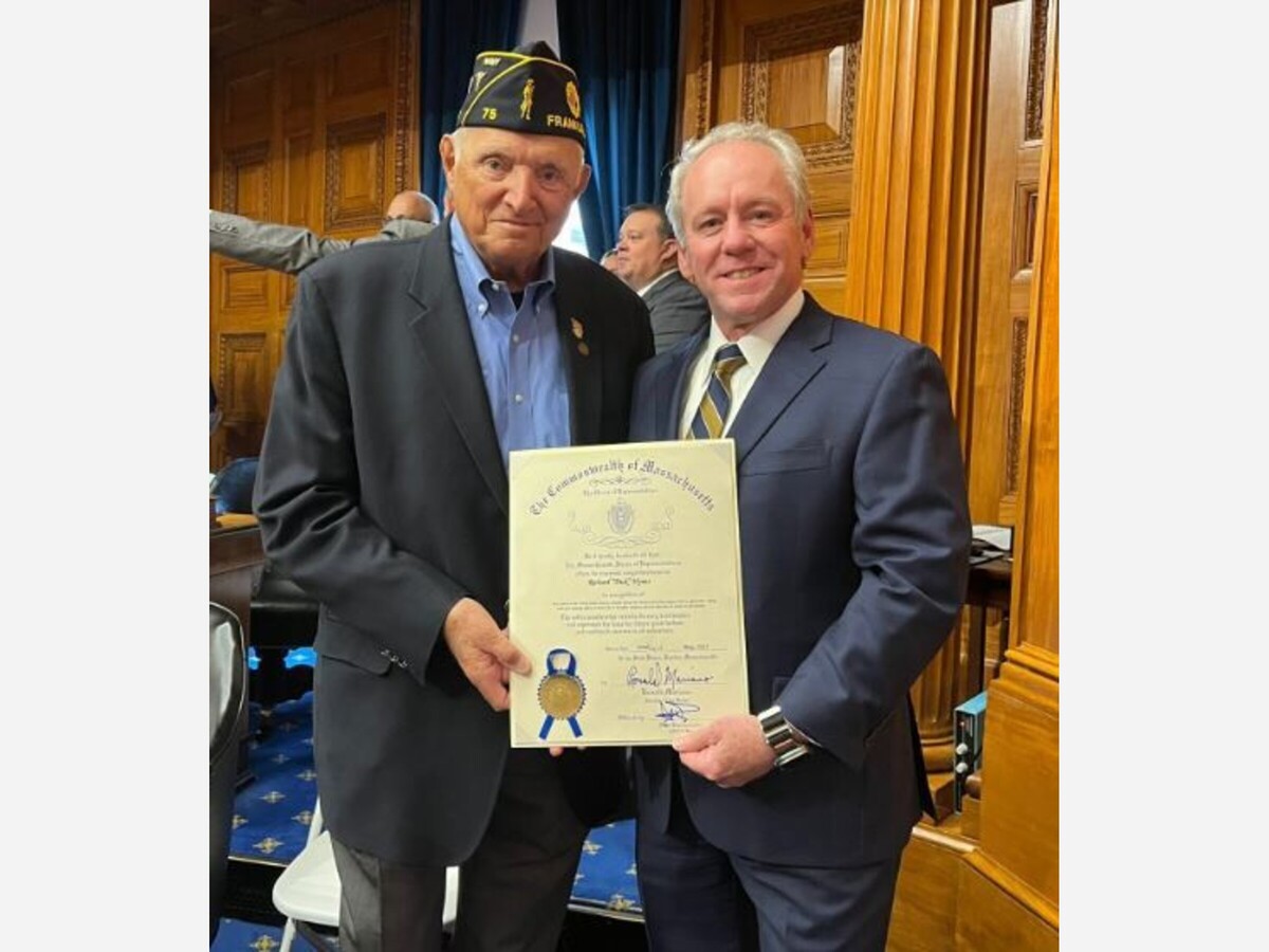 State Representative Jeffrey N. Roy (D-Franklin) proudly honored Richard “Dick” Hynes of Franklin today at the first-ever Military Appreciation Day ceremony held in the Massachusetts State House’s historic House Chamber.