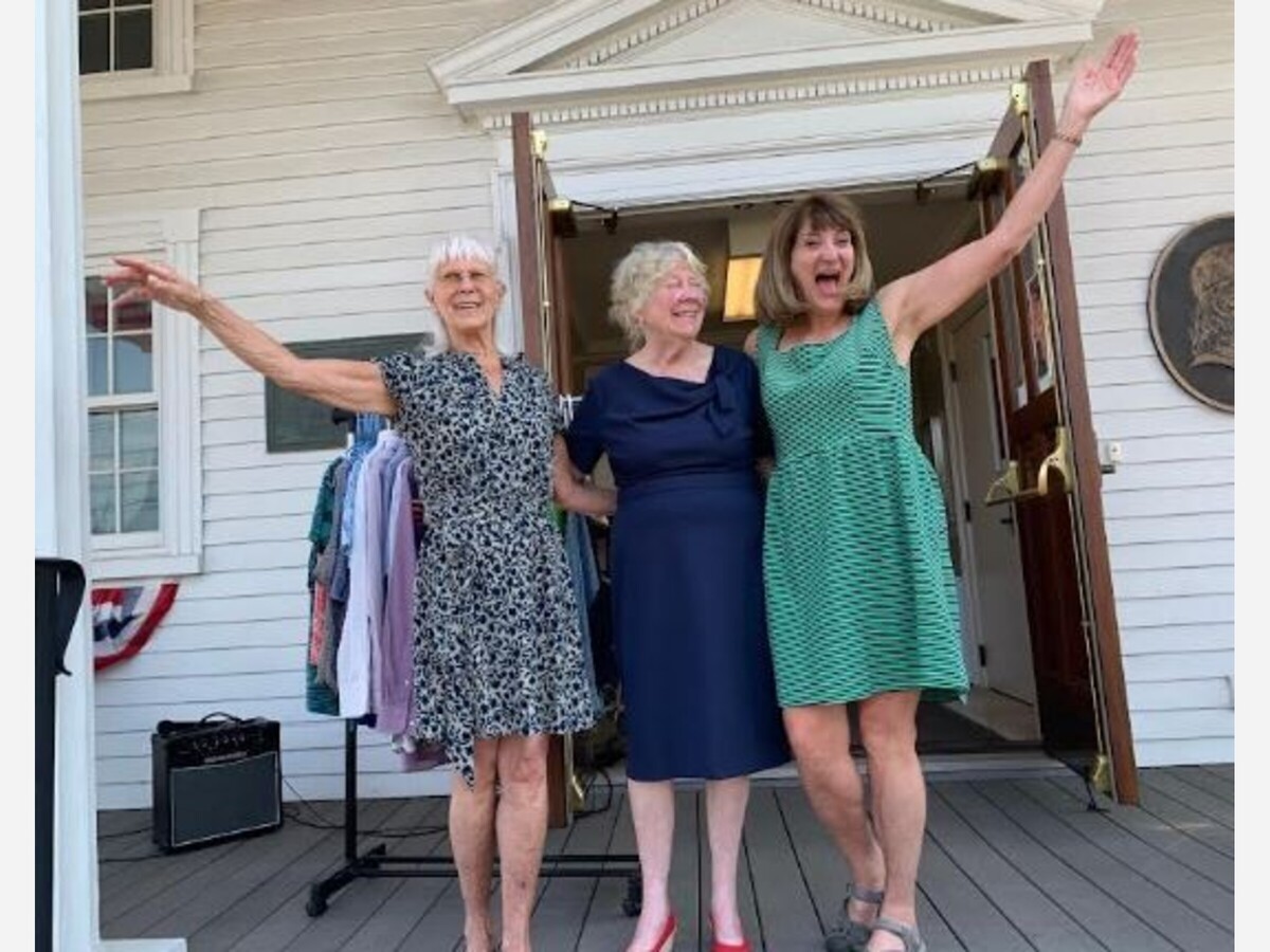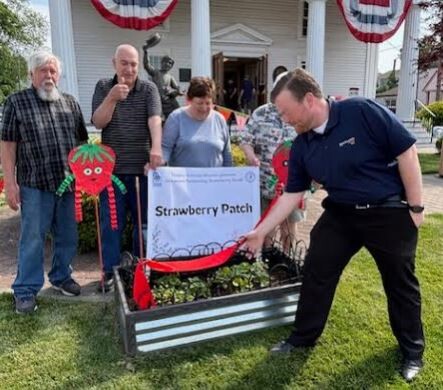 Above, Diane Cleaves, Franklin Historical Museum volunteer, Jan Prentice, Historical Commission member, and Patricia Prewitt of the Franklin United Methodist Church (FUMC) ham it up while modeling clothes from the FUMC Community Closet next door at 82 East Central Street, during Friday's Strawberry Stroll event. The Museum was also hosting a gallery show of the Franklin Art Association, and, at 4 o'clock sharp held a ribbon cutting for the new "Strawberry Patch," a small addition to the colorful downtown that reminds visitors of Franklin vibrant agricultural history with a small raised bed of real strawberries! Below, from left, Historical Commission members Paul Pisani, Alan Earls, Phyllis Malcolm and Randy LaRosa (partially obscured) look on while Rockland Trust Office Brandon Carrico (an associate member of the Commission) does the official ribbon cutting duties.