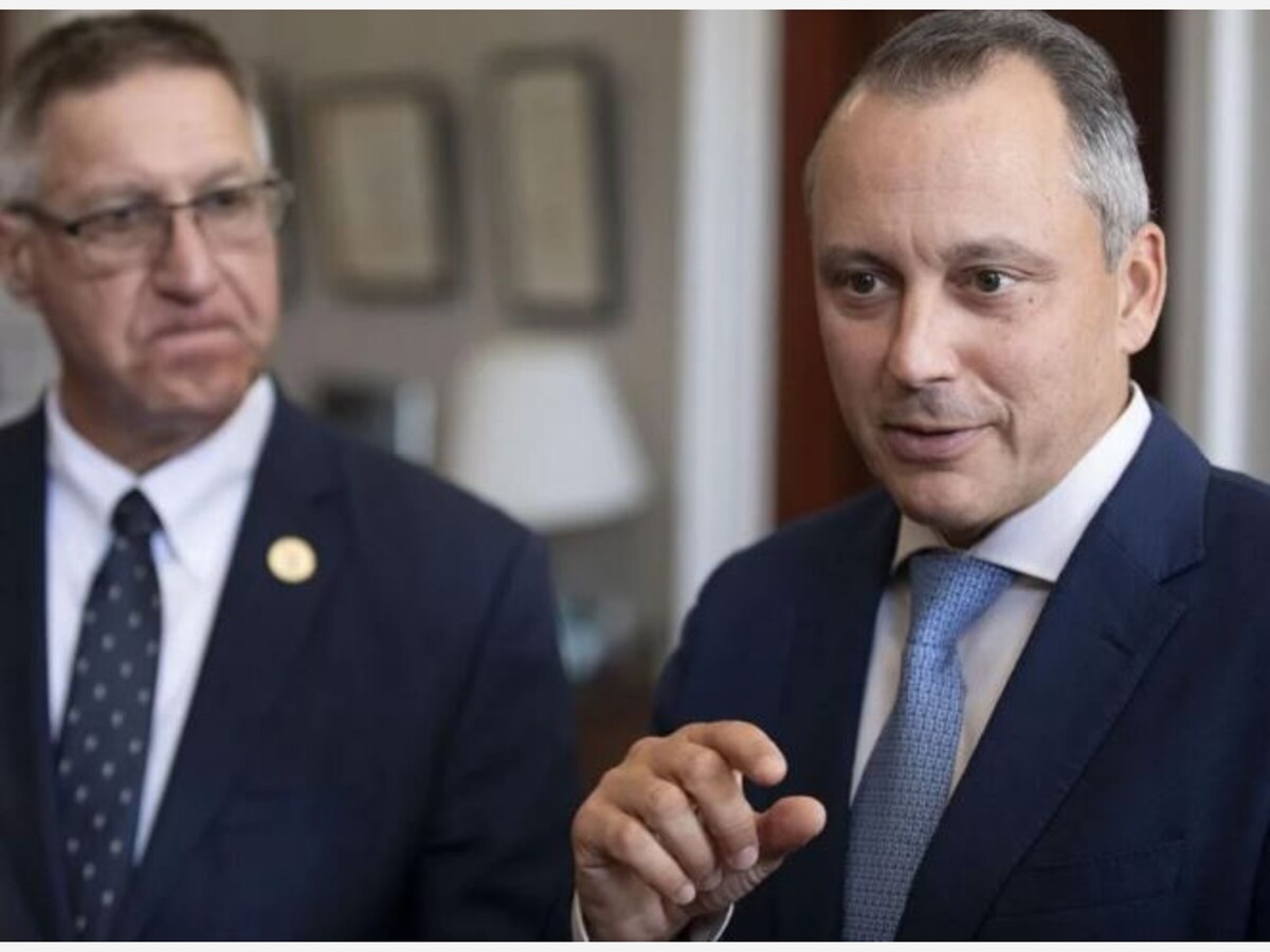 Rep. Aaron Michlewitz (right) and Sen. Michael Rodrigues (left), the lead negotiators on a fiscal year 2025 surtax spending bill, field questions from reporters after finalizing an agreement on June 16, 2025.