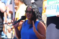 President of the Greater Boston Labor Council AFL-CIO, Darlene Lombos, speaks at a rally on the State House steps about autonomous vehicles on June 24, 2025.