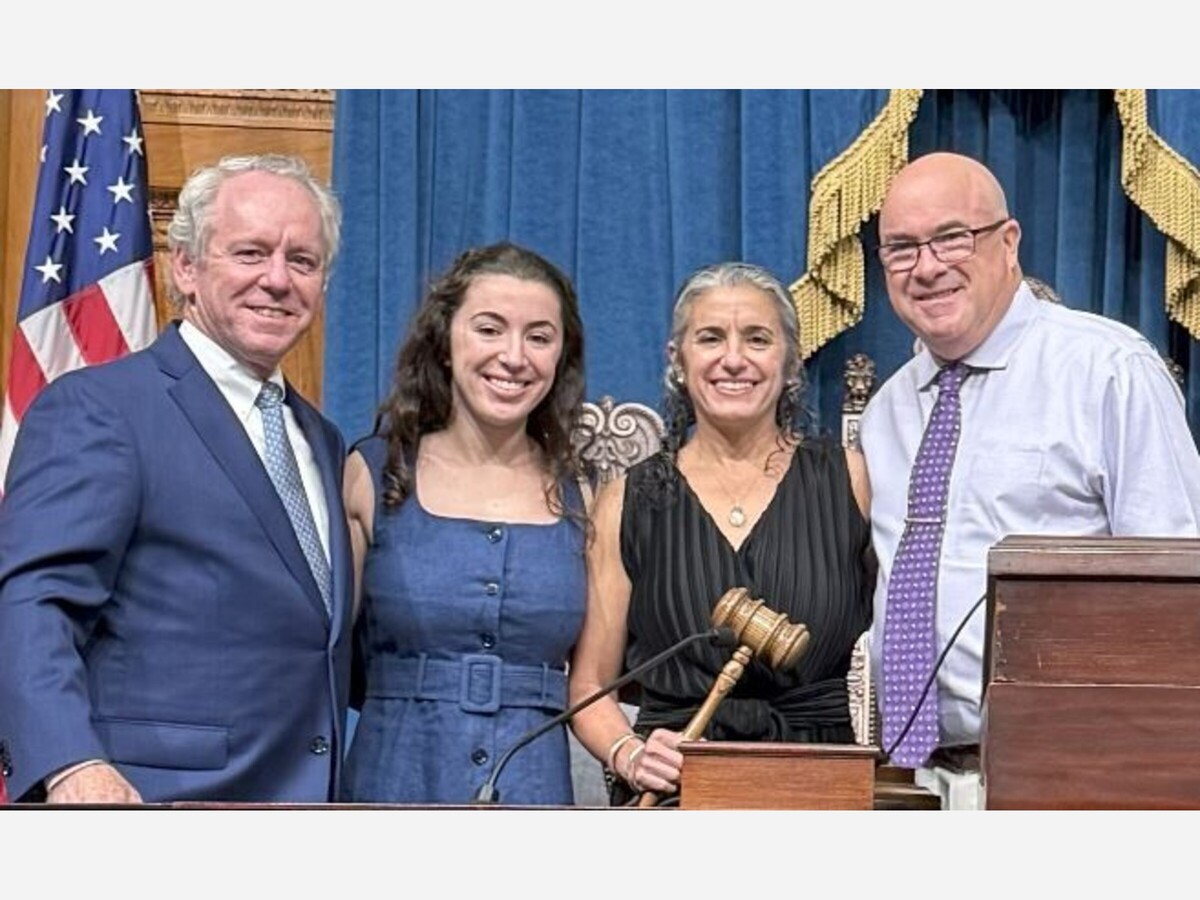 Above, Rep. Jeff Roy, Samantha Powderly (Tina's daughter), Tina Powderly, and husband Scott Mason. (photo by Aarush Rao, Franklin High School Student intern)
