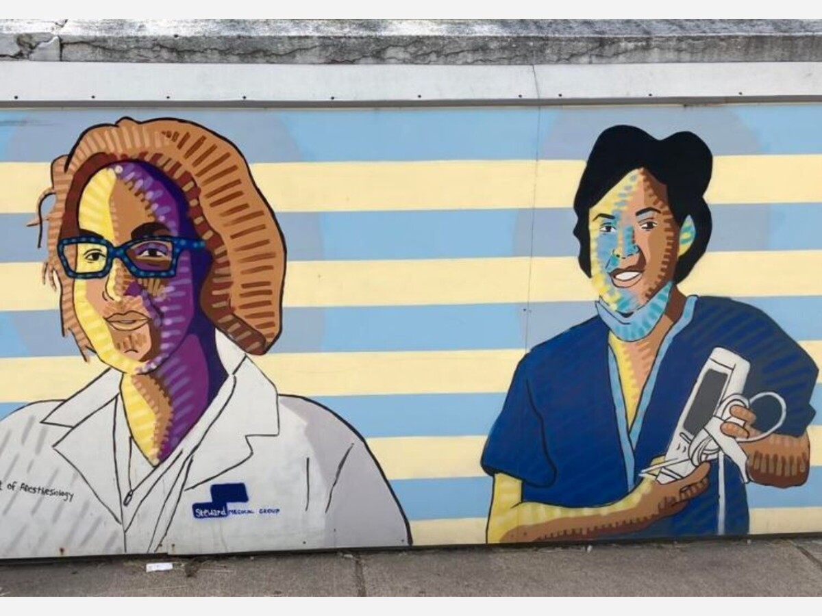A mural outside the formerly Steward-owned St. Elizabeth's Medical Center in Brighton, which is now part of Boston Medical Center.